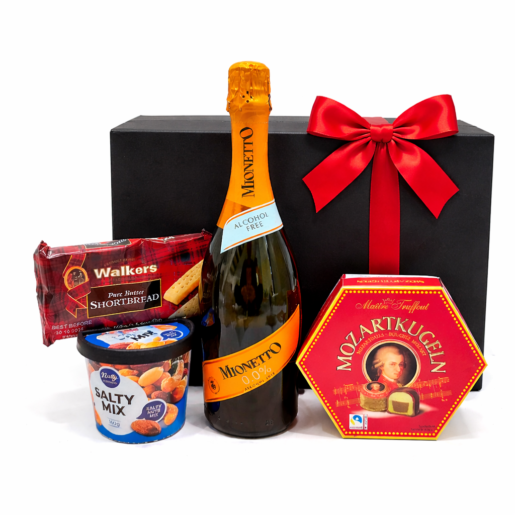 A refined and tasteful gift box featuring premium chocolates, savory snacks, and alcohol-free sparkling wine. A perfect choice for celebrations, corporate gifting, thank-you gestures, or any occasion where elegance matters.