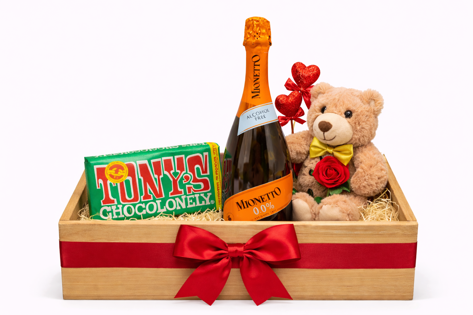 A charming Valentine’s gift with a romantic touch — beautifully arranged in a light wooden gift box with elegant straw filling and finished with a red satin ribbon. Perfect for anniversaries, Valentine’s Day, or simply to surprise someone you love.