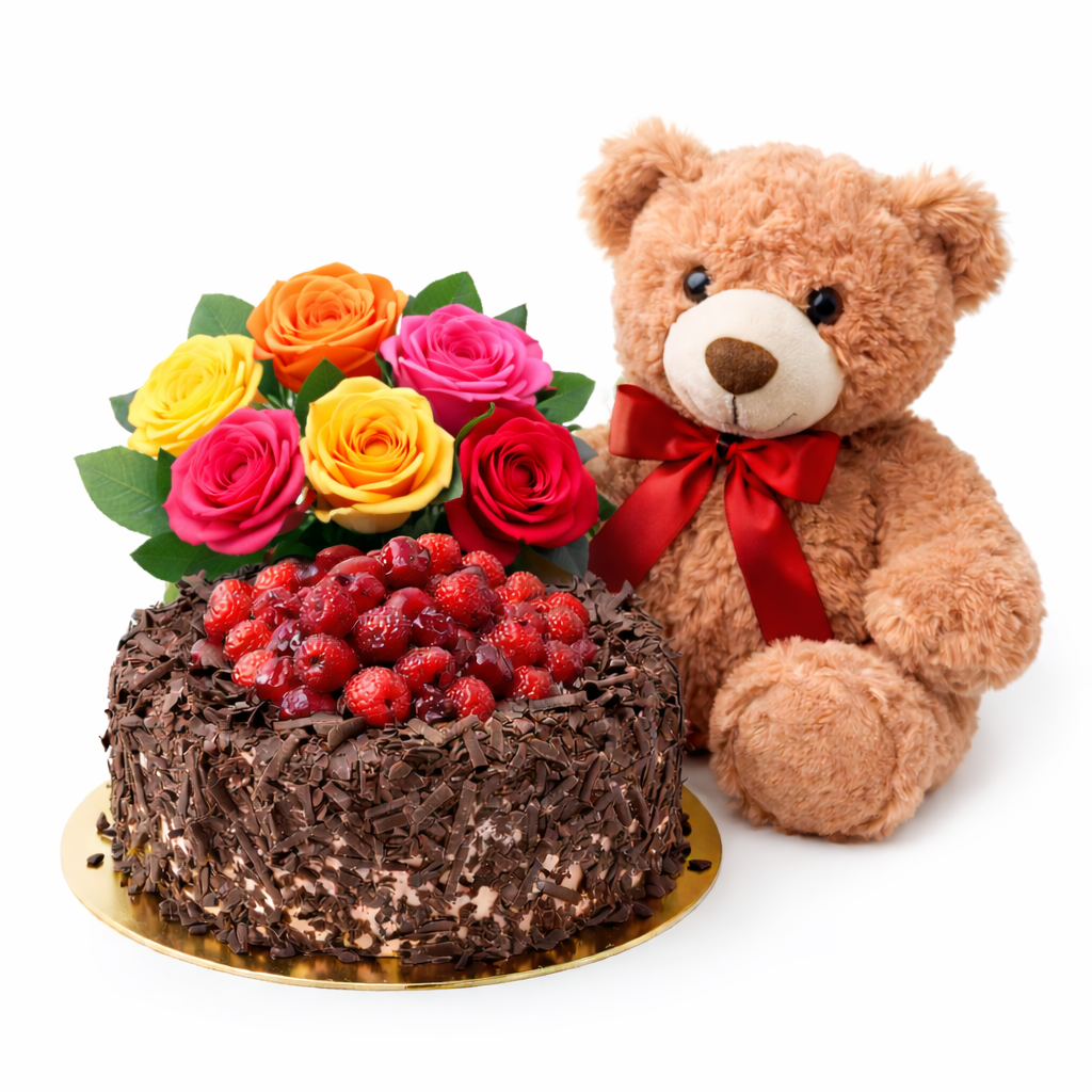 A romantic and sweet gift set featuring a delicious raspberry chocolate cake, a soft teddy bear, and six classic roses. Perfect for birthdays, anniversaries, Valentine’s Day, or whenever you want to surprise someone with something unforgettable.