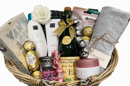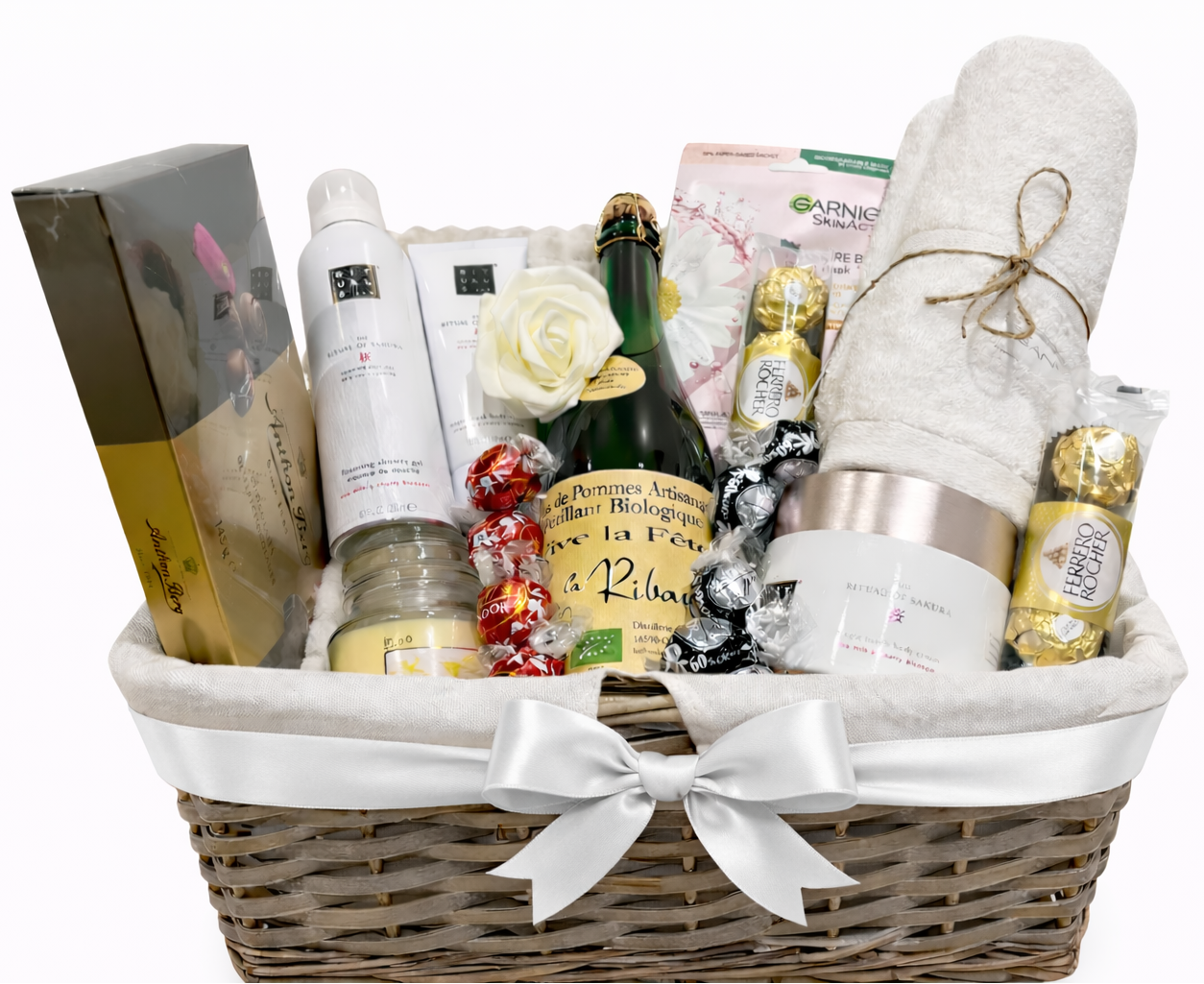 An elegant spa gift basket with white Rituals products, fine chocolates, and cozy accessories — crafted to bring relaxation and peace of mind.