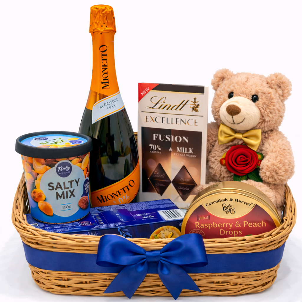 A romantic and thoughtfully curated gift basket — perfect for Valentine’s Day, anniversaries, birthdays, or when you want to surprise someone with something sweet and elegant. Beautifully presented in a wooden basket with decorative filler and a satin ribbon.