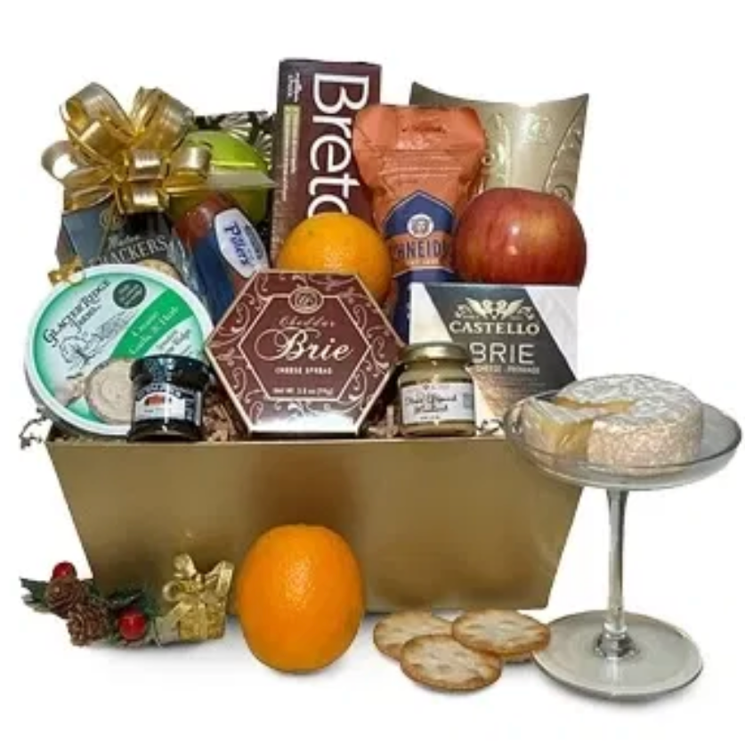 En klassisk korg fylld med en balanserad blandning av ostar, kex, frukt och gourmettillbehör – garanterat en publikfavorit.
