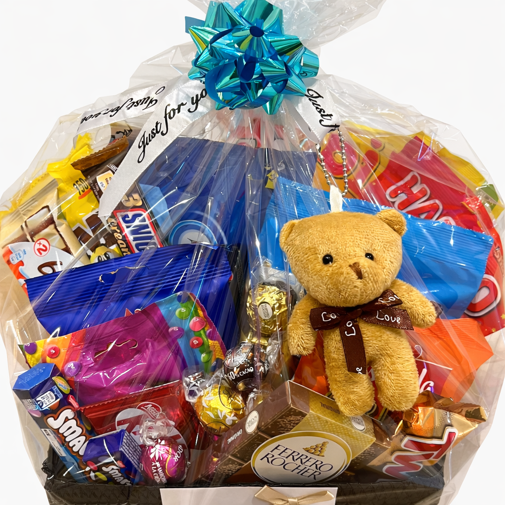 En härlig korg full av mer än 18 sorters choklad och godis – den ultimata godbiten för alla sötsugare.