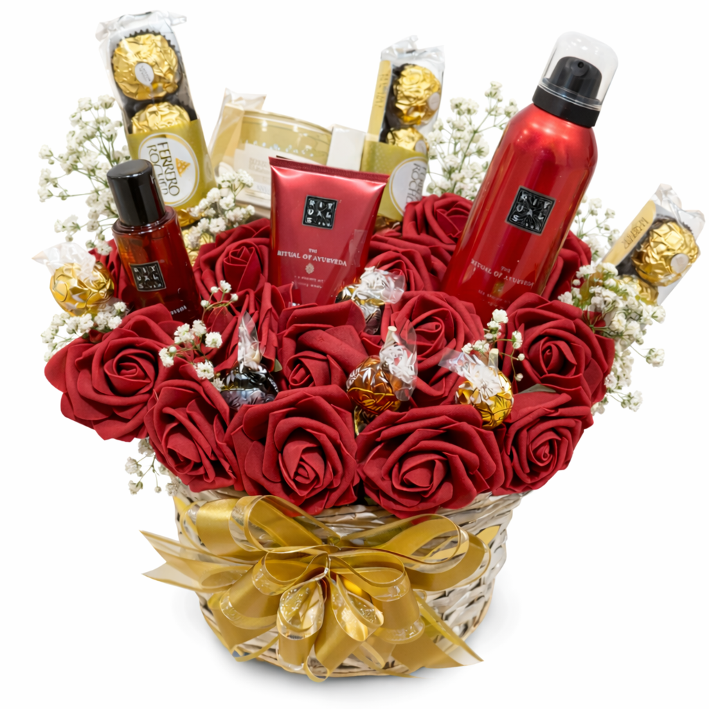 En elegant och romantisk presentkorg med rosor, fina chokladbitar och lyxiga egenvårdsprodukter – omsorgsfullt arrangerad för en verkligt minnesvärd gest.