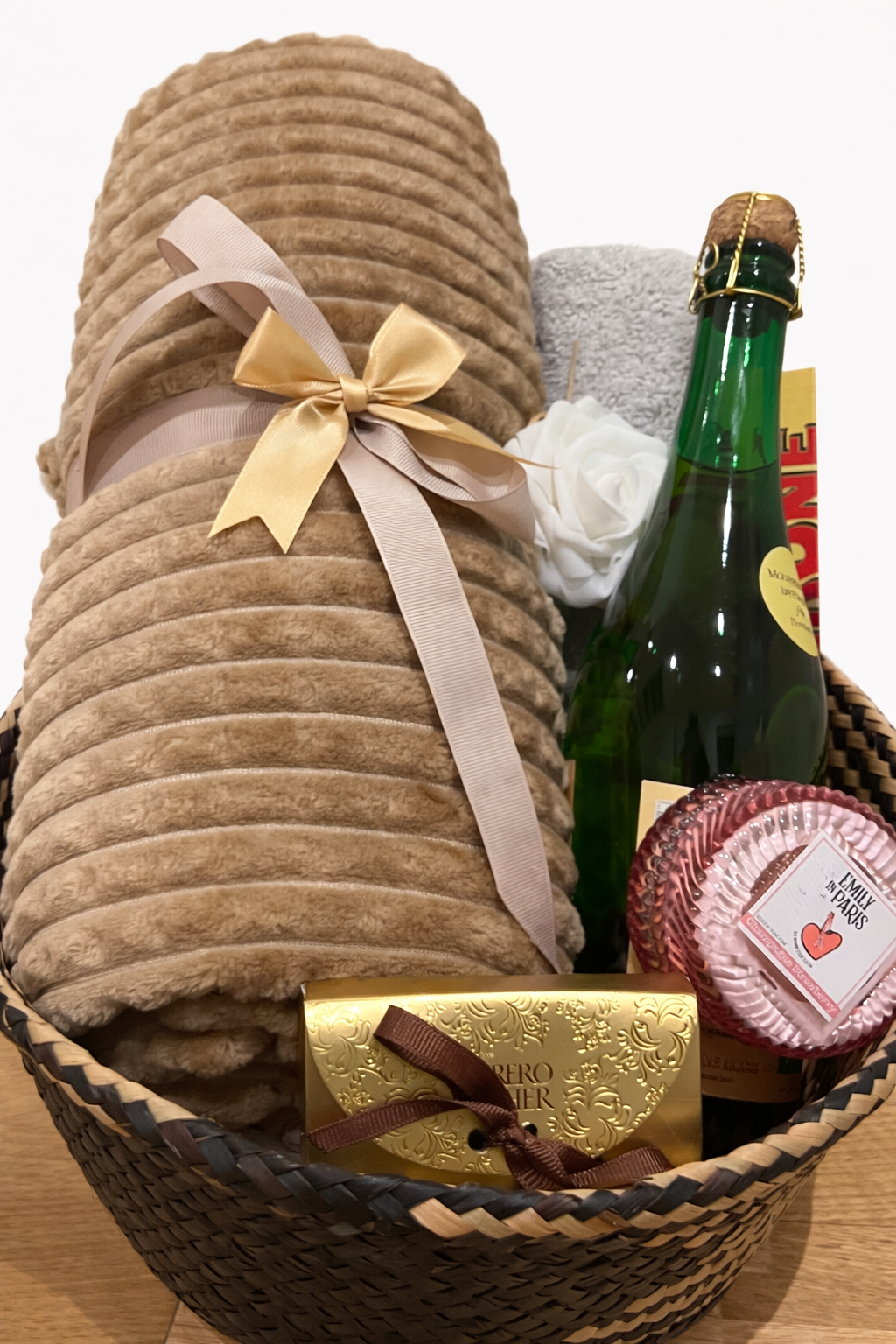En varm och inbjudande korg med sötsaker, mjuka detaljer och en mousserande dryck – perfekt för en avkopplande kväll.