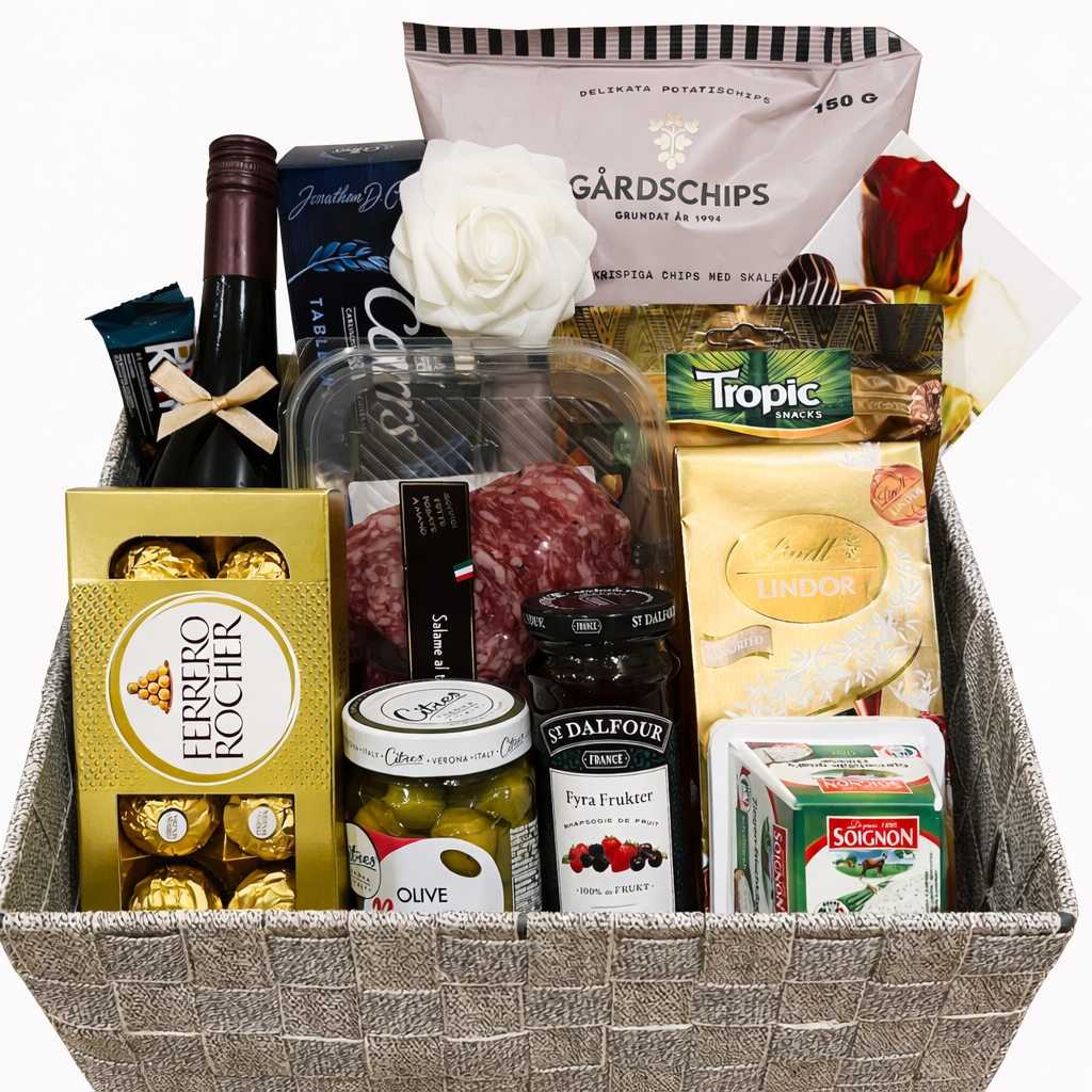 En lyxig korg fullpackad med ett rikt utbud av söta, salta och gourmetgodisar – en sann smakexplosion för alla tillfällen.