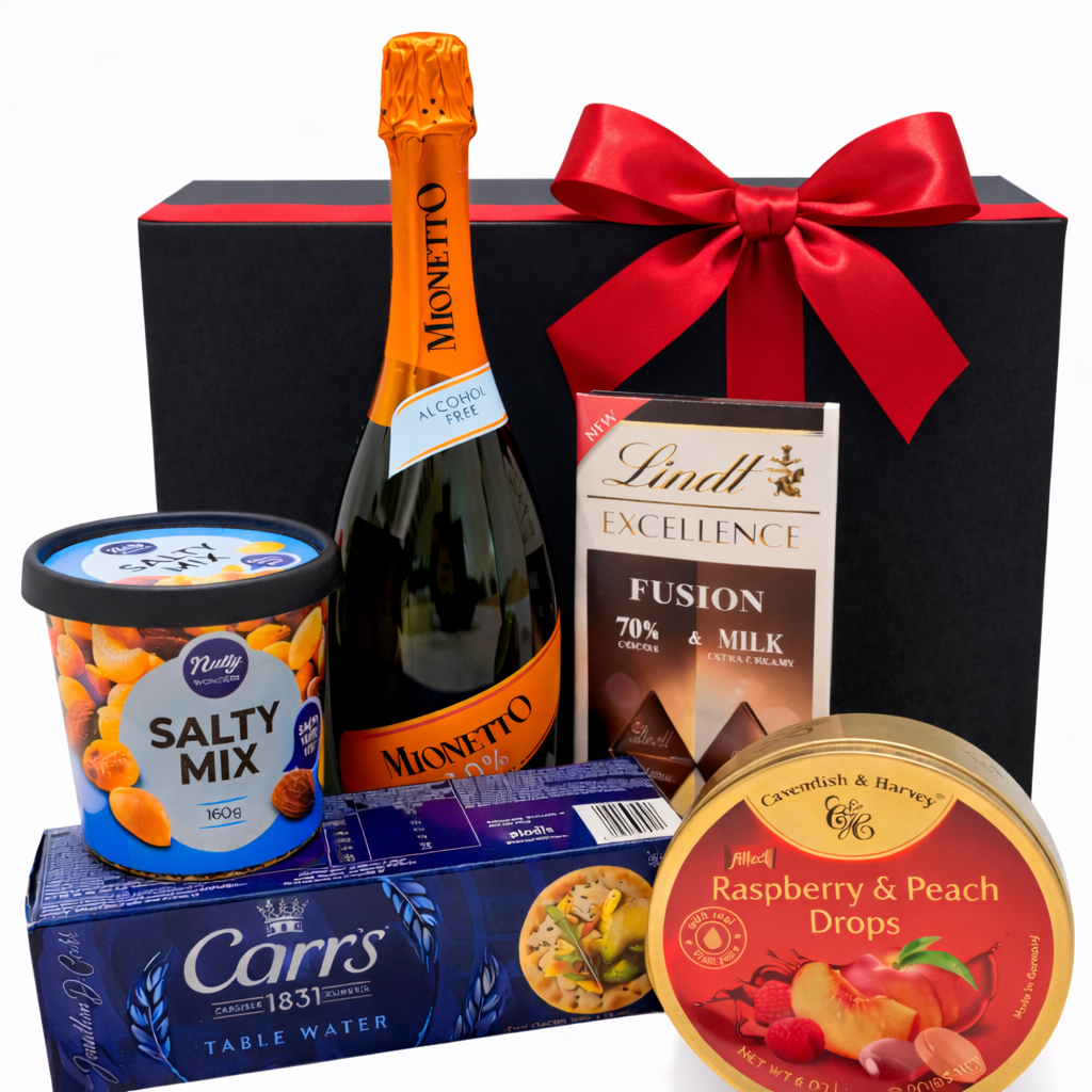 Ett raffinerat och alkoholfritt urval av gourmetsötsaker och salta snacks – perfekt att fira, dela eller ge bort med elegans och omsorg.