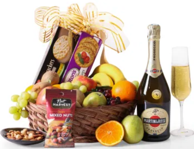 En livfull presentkorg full av färsk frukt, kex, choklad och nötter – en härlig blandning av hälsa och njutning.