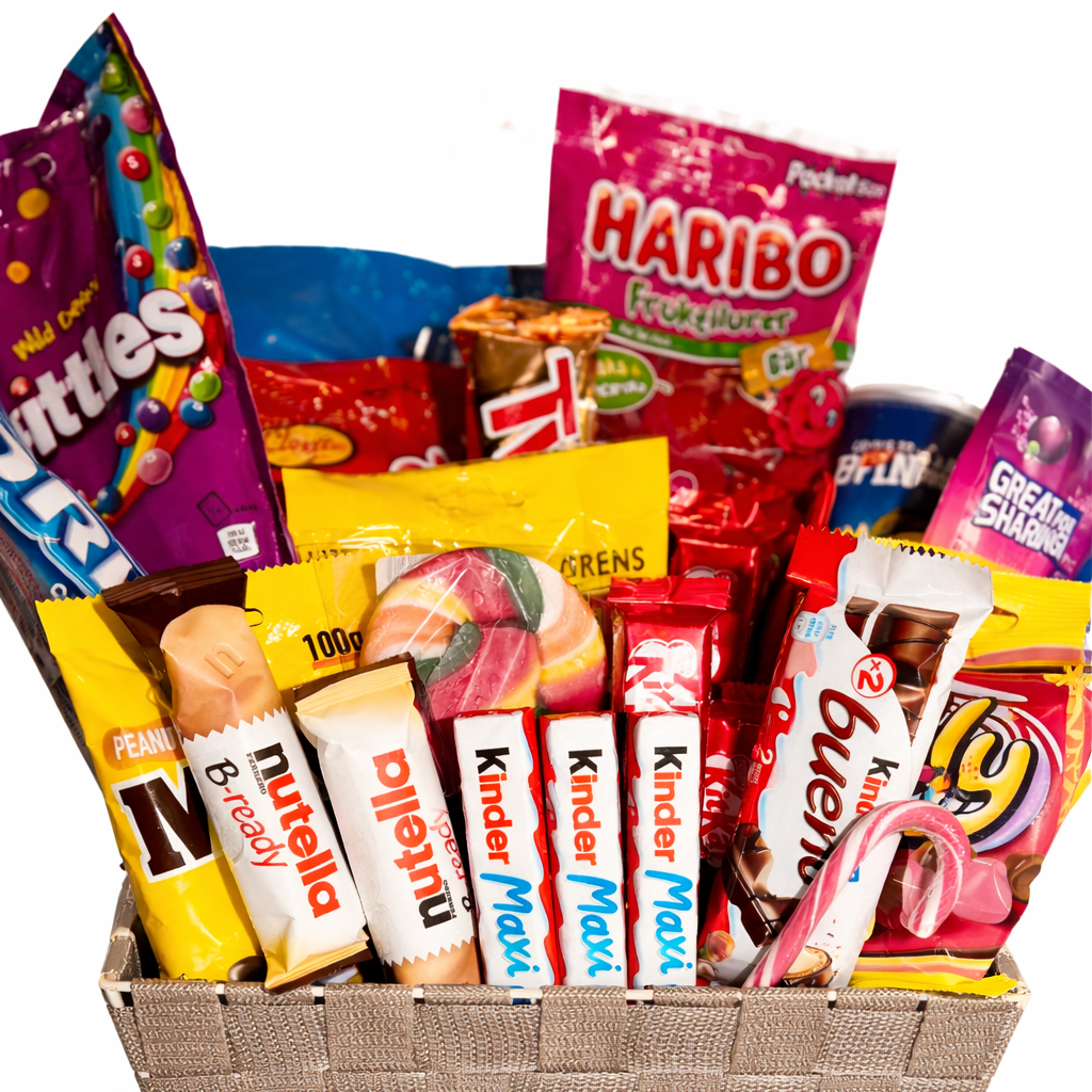 En stor godiskorg fylld med en oemotståndlig blandning av klassiska sötsaker, chips och choklad – den ultimata godbiten att dela eller överraska någon speciell.