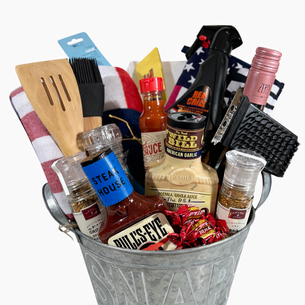 En komplett grillpresentkorg med allt du behöver – såser, kryddor, redskap och alkoholfritt vin. Perfekt för grillälskare, året runt.