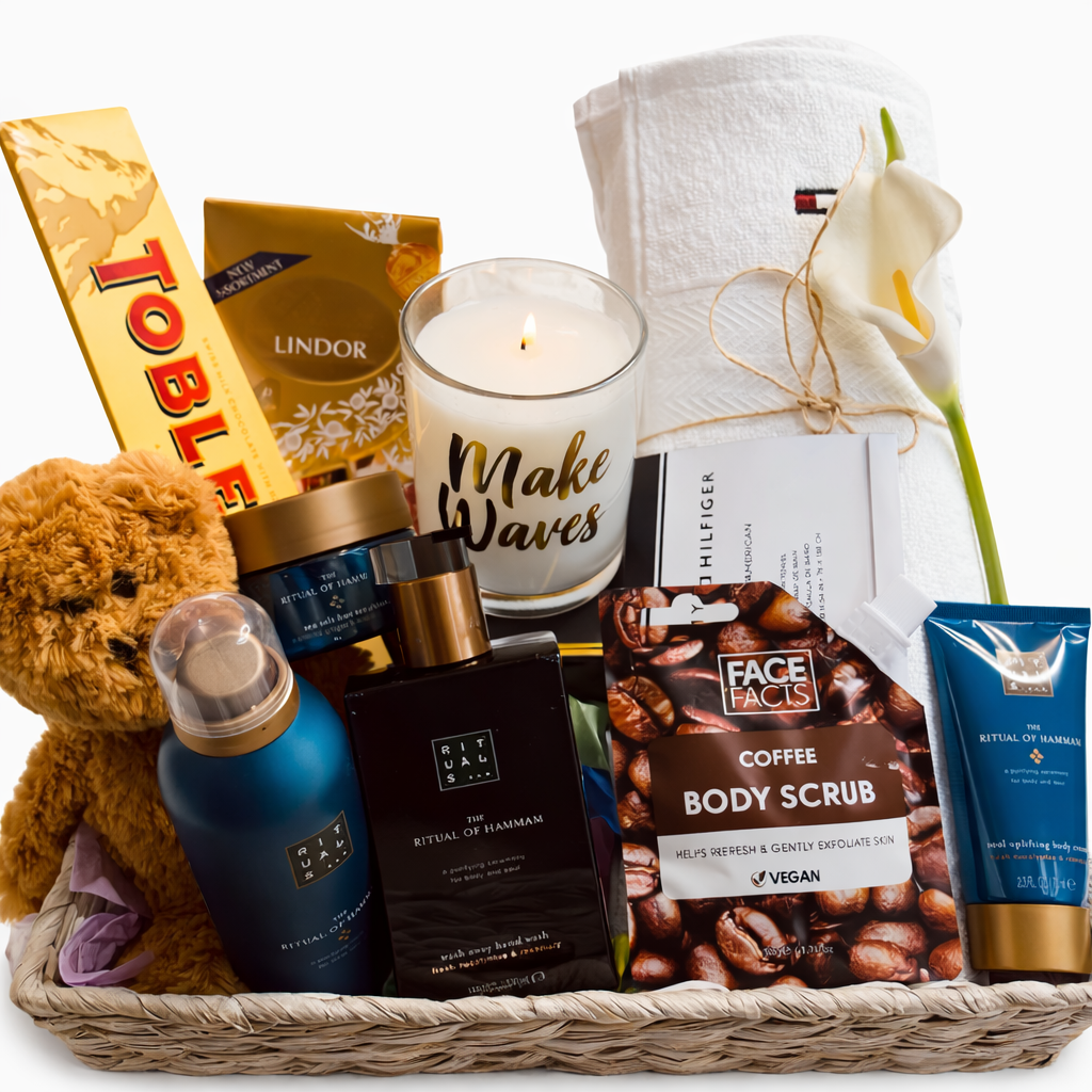 En lyxig spa-korg med väldoftande Rituals-produkter, sötsaker och mysiga detaljer – komplett med en gosig nallebjörn för den ultimata bortskämningsupplevelsen.