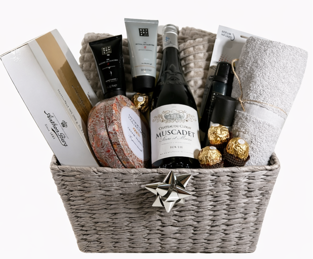 En maskulin och avkopplande spa-korg med Rituals-produkter för män, mysiga basvaror, choklad och mousserande alkoholfri cider – perfekt för en elegant present i form av välbefinnande och komfort.
