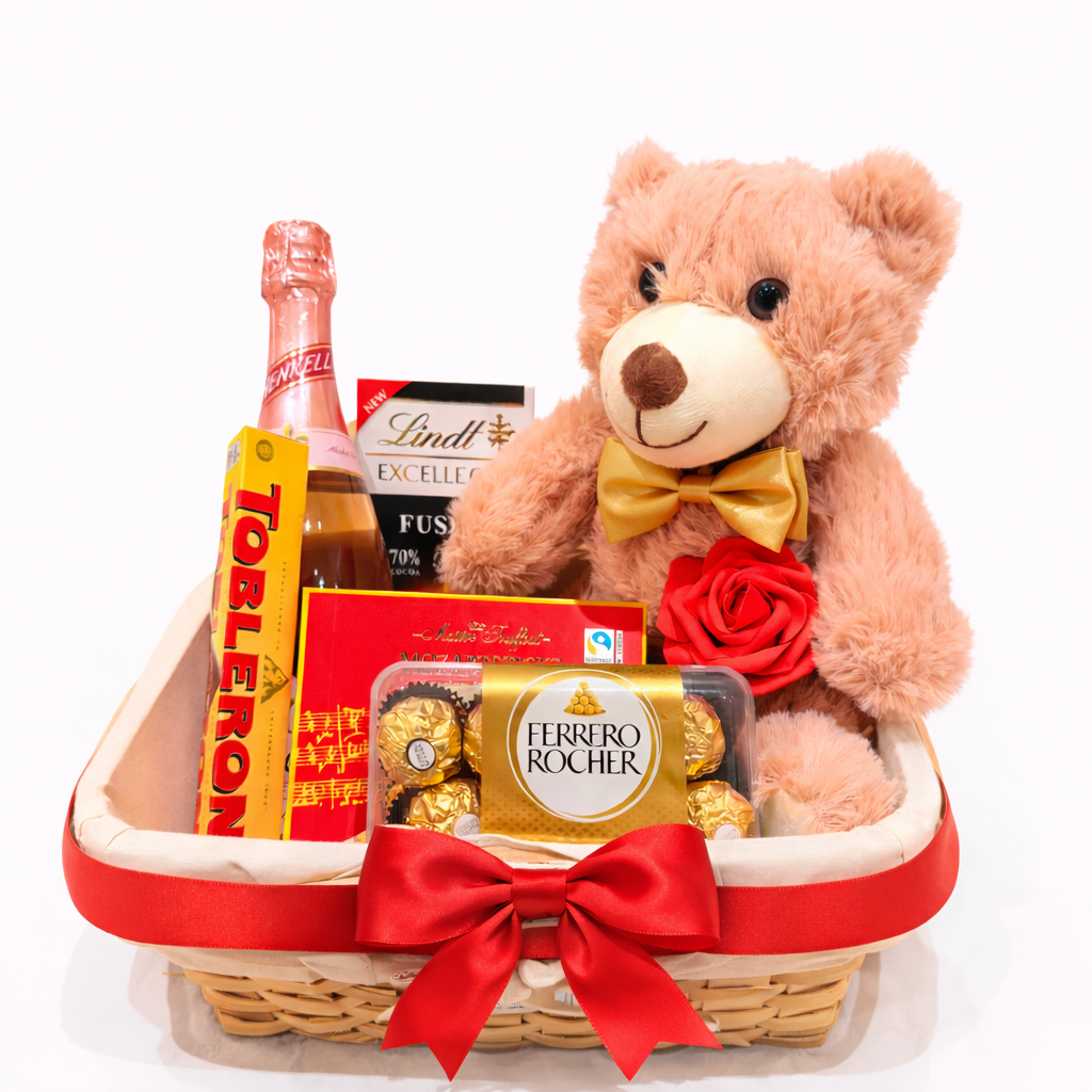 A heartwarming and luxurious gift basket filled with premium chocolates, alcohol-free sparkling rosé, and a soft teddy bear. Perfect for birthdays, romantic surprises, congratulations, baby celebrations, or when you want to send love in a thoughtful way.