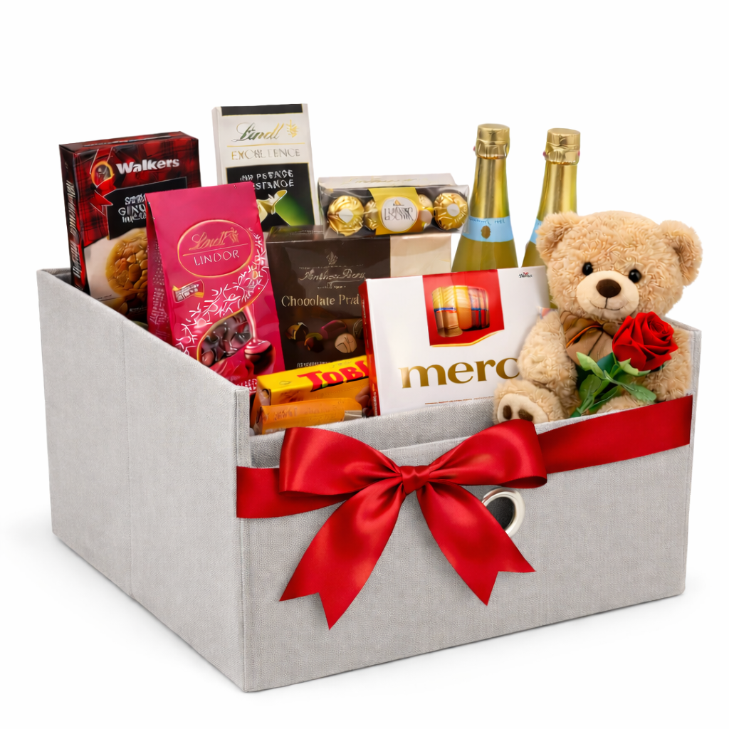En exklusiv presentkorg fylld med ikoniska chokladbitar, kex och alkoholfritt mousserande vin – perfekt för födelsedagar, firanden, tackpresenter, högtider eller företagspresenter. Vackert arrangerad och avslutad med ett gratulationskort.