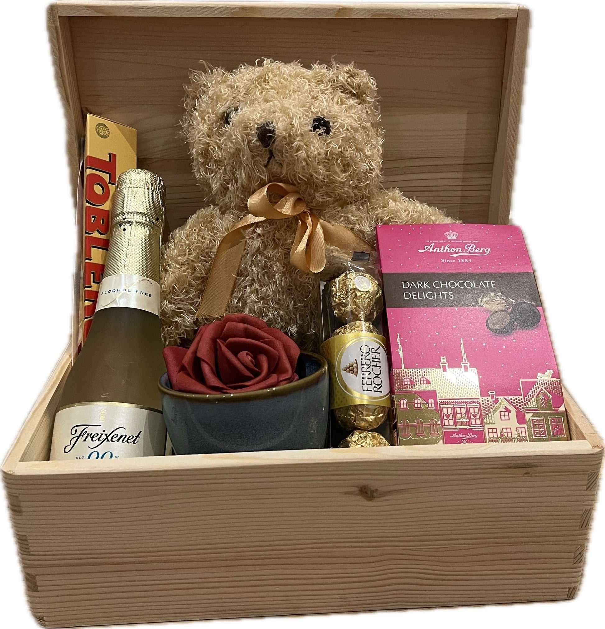 En söt och charmig presentkorg med en mjuk nallebjörn, läckra chokladbitar och en uppfriskande alkoholfri dryck – perfekt för födelsedagar, alla hjärtans dag eller helt enkelt för att visa att du bryr dig.