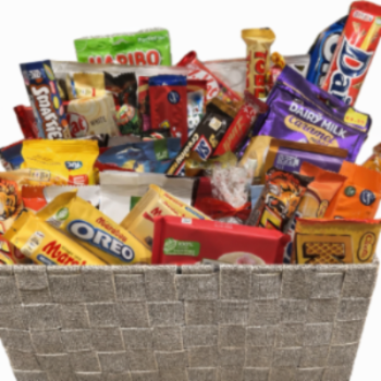 En enorm presentkorg fylld med ett imponerande urval av choklad och godis, med över 40st och med olika sorter.