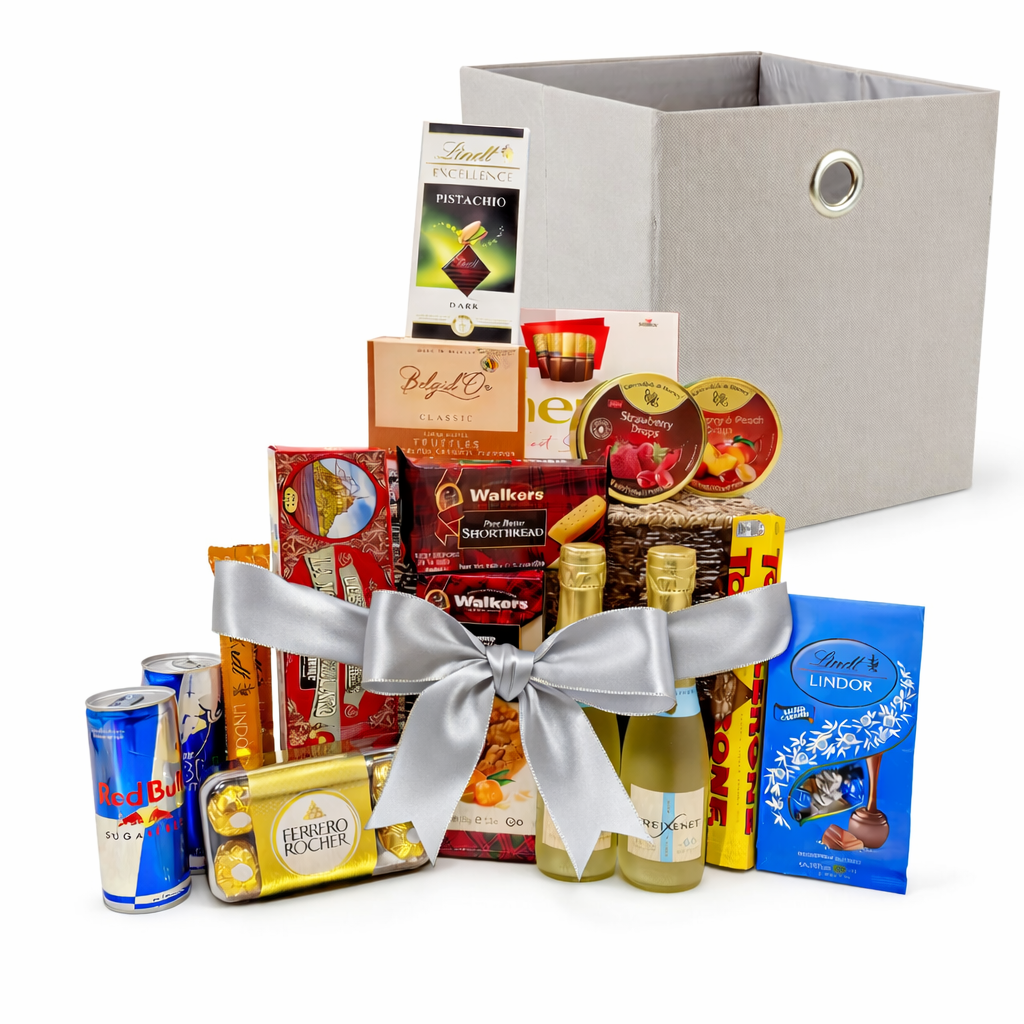 En lyxig presentkorg fylld med premiumchoklad, klassiska kex och uppfriskande godsaker – vackert arrangerade i en rottingkorg och avslutade med ett silverband. Perfekt för födelsedagar, fester, tackpresenter, högtider eller företagspresenter.
