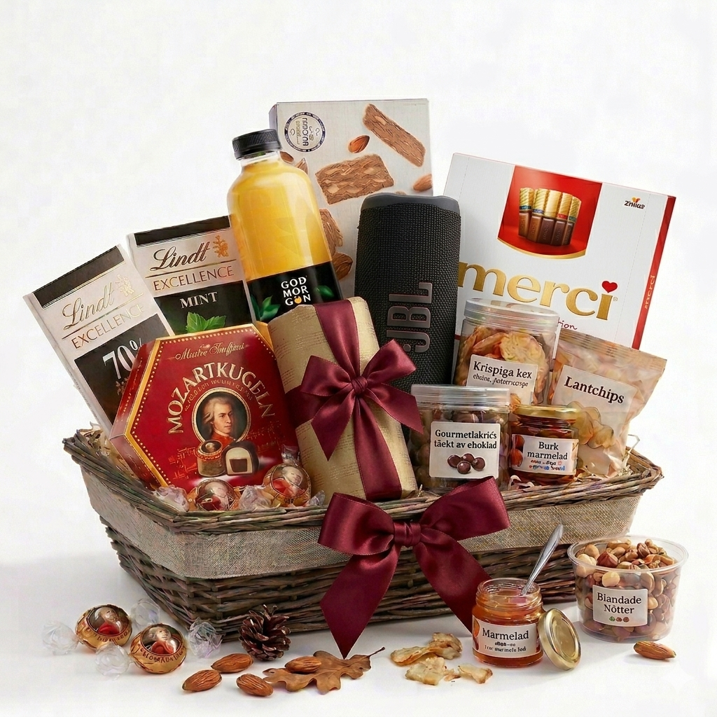 En exklusiv gourmetkorg fylld med noggrant utvalda premiumdelikatesser och en modern touch. Korgens mittpunkt är en stilren, svart JBL-högtalare, som sätter tonen för en minnesvärd stund av avkoppling och ren smakglädje. Den perfekta gåvan för den som uppskattar både klassisk lyx och modern teknik.