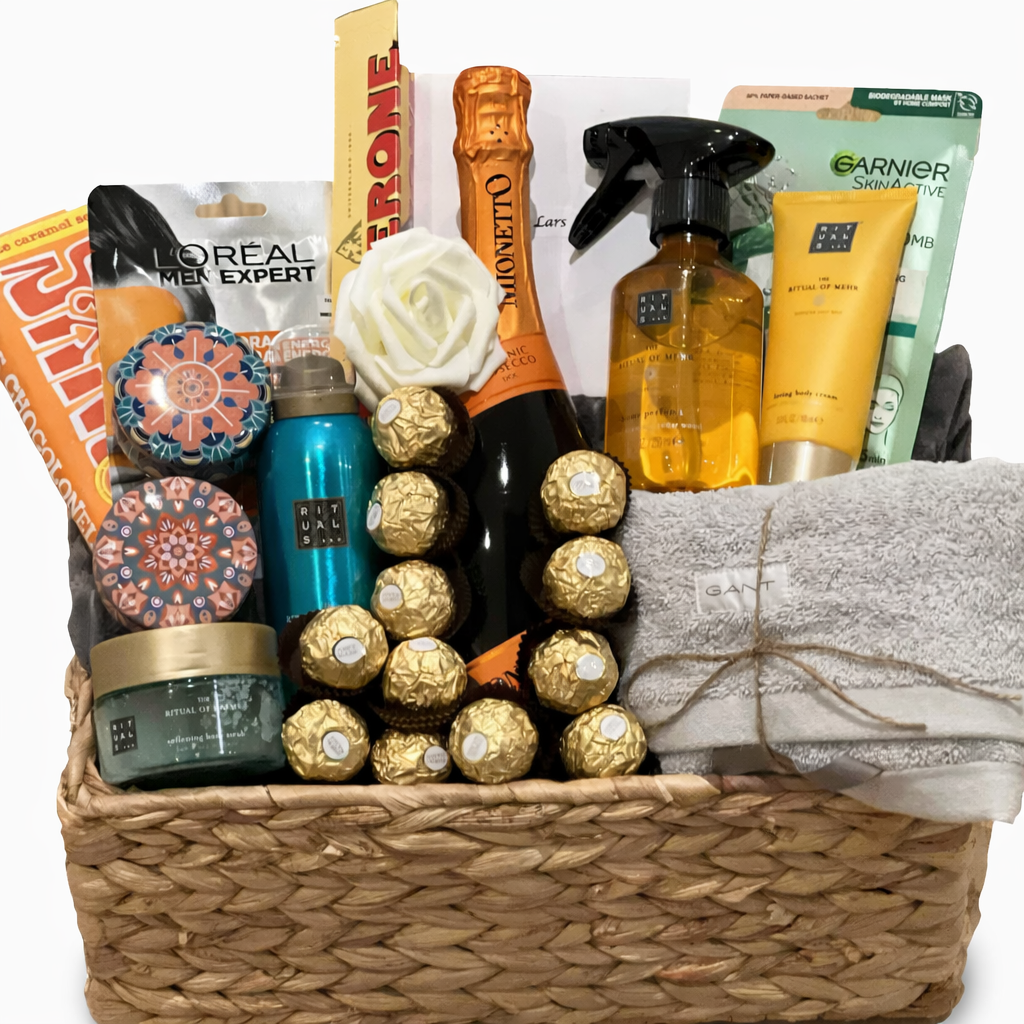 En lyxig unisex spa-korg med Rituals-produkter för både män och kvinnor, mysiga väsentligheter och söt njutning – perfekt för att dela avkoppling tillsammans.